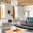 Dès l’entrée, on comprend que la restauration réalisée dans cette bâtisse a été faite avec le plus grand soin. Alliant matériaux modernes et respect de l’ancien, la grande pièce de vie est chaleureuse et lumineuse avec de grandes ouvertures et un poêle à bois. Le sol en béton ciré a été appliqué après un décaissement total pour éviter des remontées humides, défaut rencontré parfois dans les maisons anciennes.