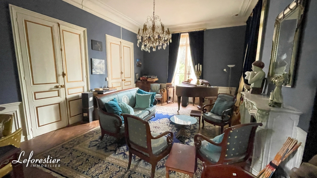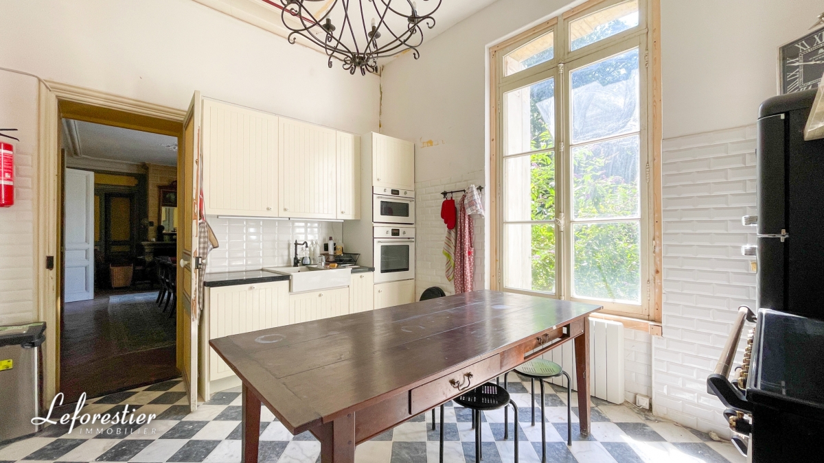 The entrance hall crossed, the chic and cozy atmosphere is felt. The large living room opens to the south through high and wide windows towards the porch overlooking the park. The spectacle is striking. The reception rooms are spacious, equipped with magnificent fireplaces and period herringbone parquet floors. The kitchen is warm, opening onto an old boudoir used as a small family and friendly dining room.