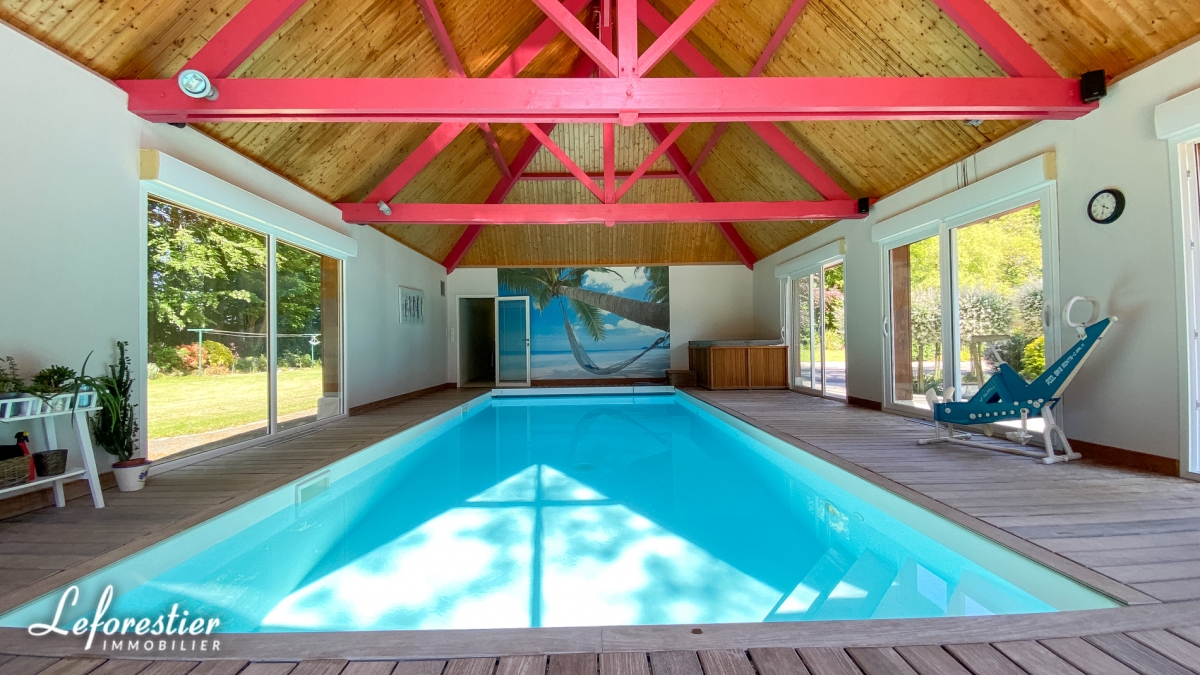 In the newer part, you will find a small garage, a bathroom and above all an indoor swimming pool of 8m x 4m. Heated by a heat pump using geothermal energy, treated with salt, dehumidified by a high-performance system and equipped with an electric submerged roller shutter, this pool is "high-end" for a completely reasonable maintenance cost thanks to its this quality equipment.