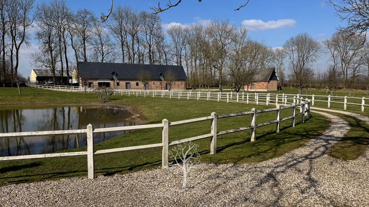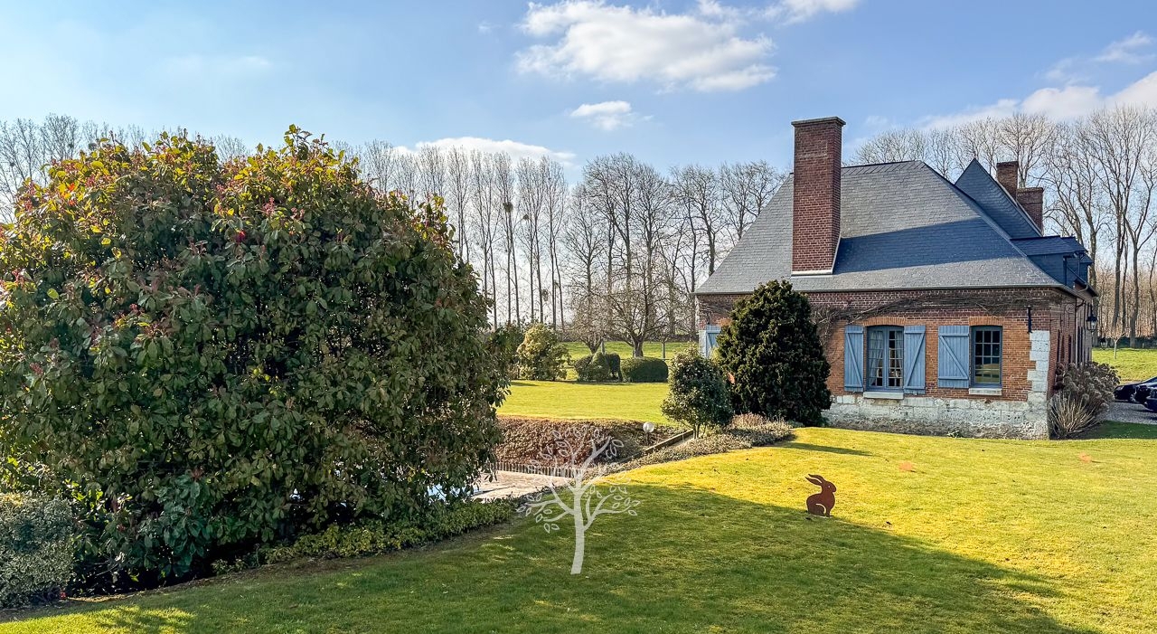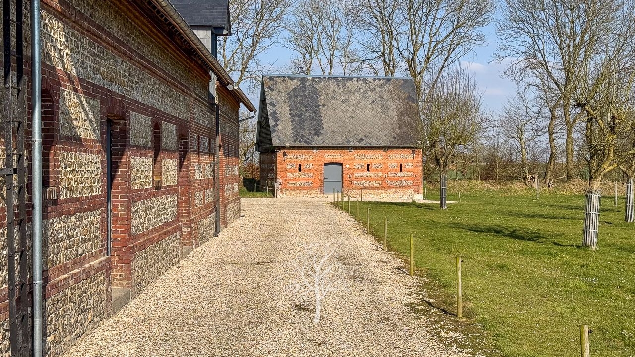 The charm of the property is felt as soon as you enter the gate. The park, perfectly maintained by its owner, reveals a beautiful composition: cement railings, carefully arranged apple trees, and a clos-masure restored in keeping with the Caux tradition. Each landscaped element reflects the spirit of Norman heritage.