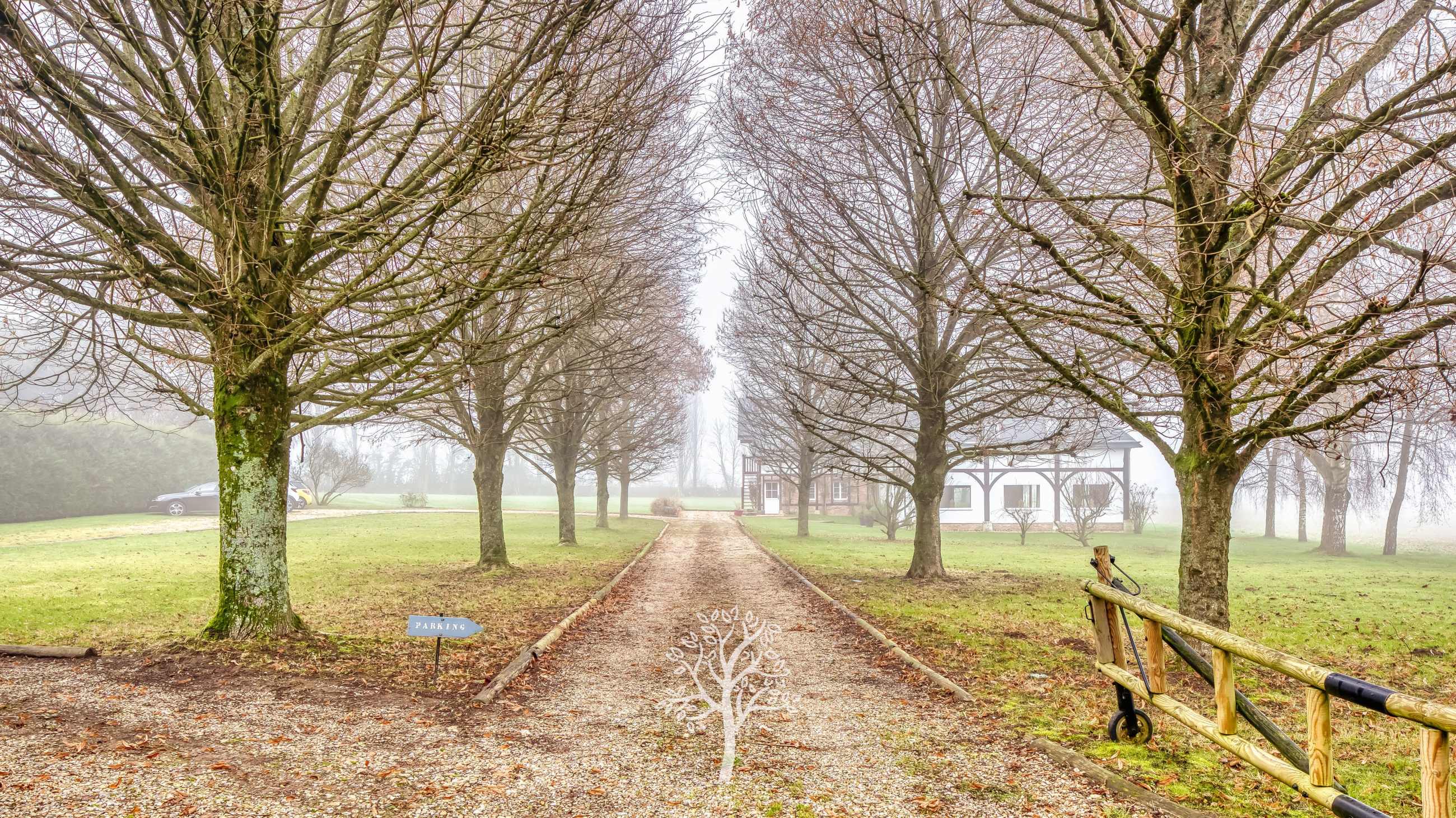 Au bout d’une allée bordée de tilleuls, la maison, ornée de rosiers grimpants, séduit immédiatement par ses volumes généreux et sa luminosité omniprésente.