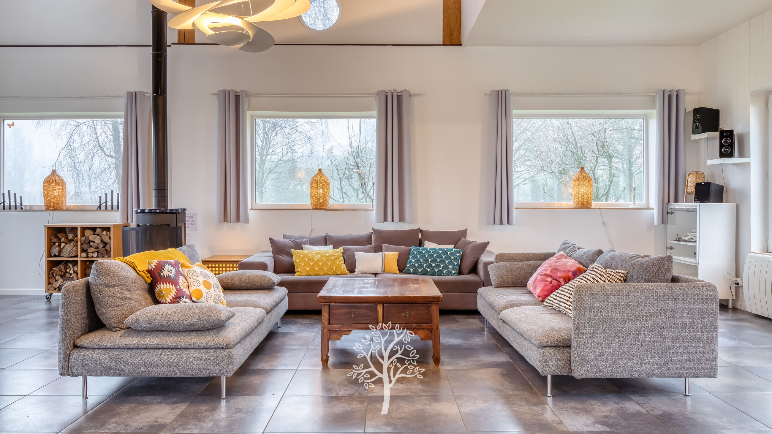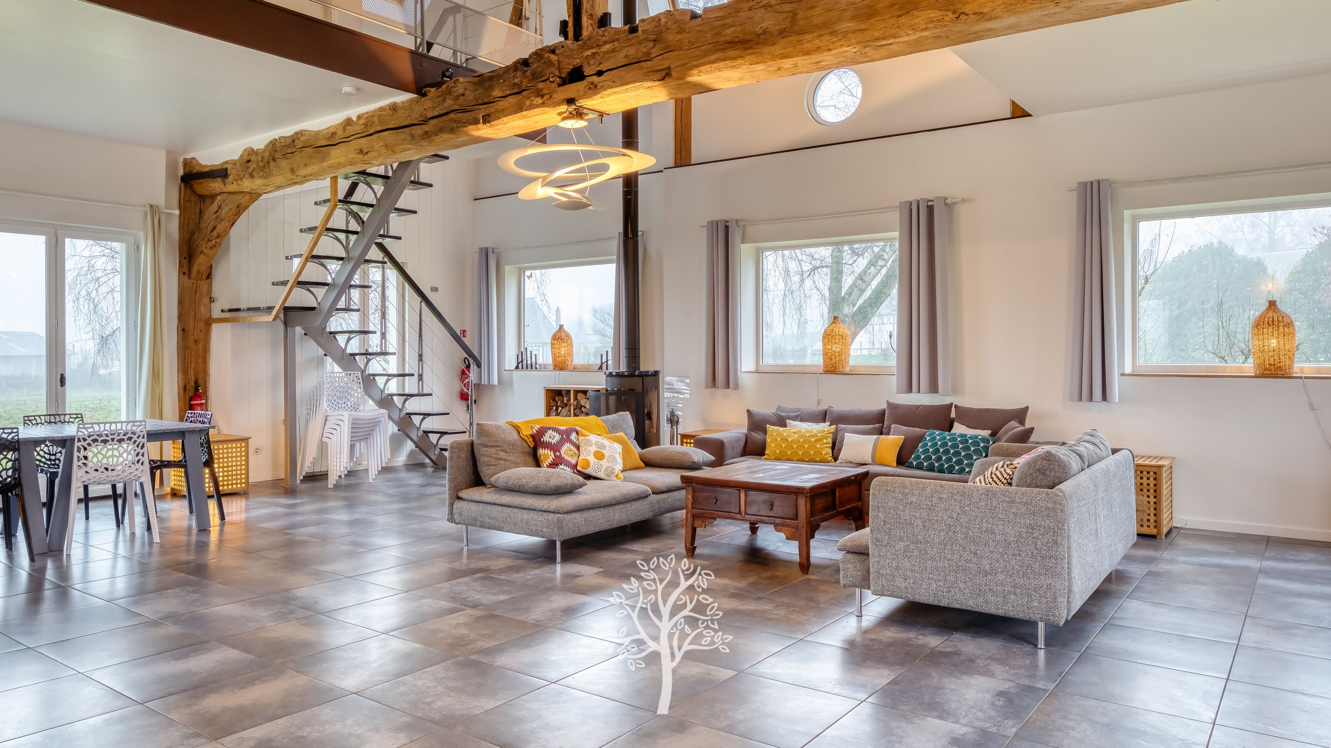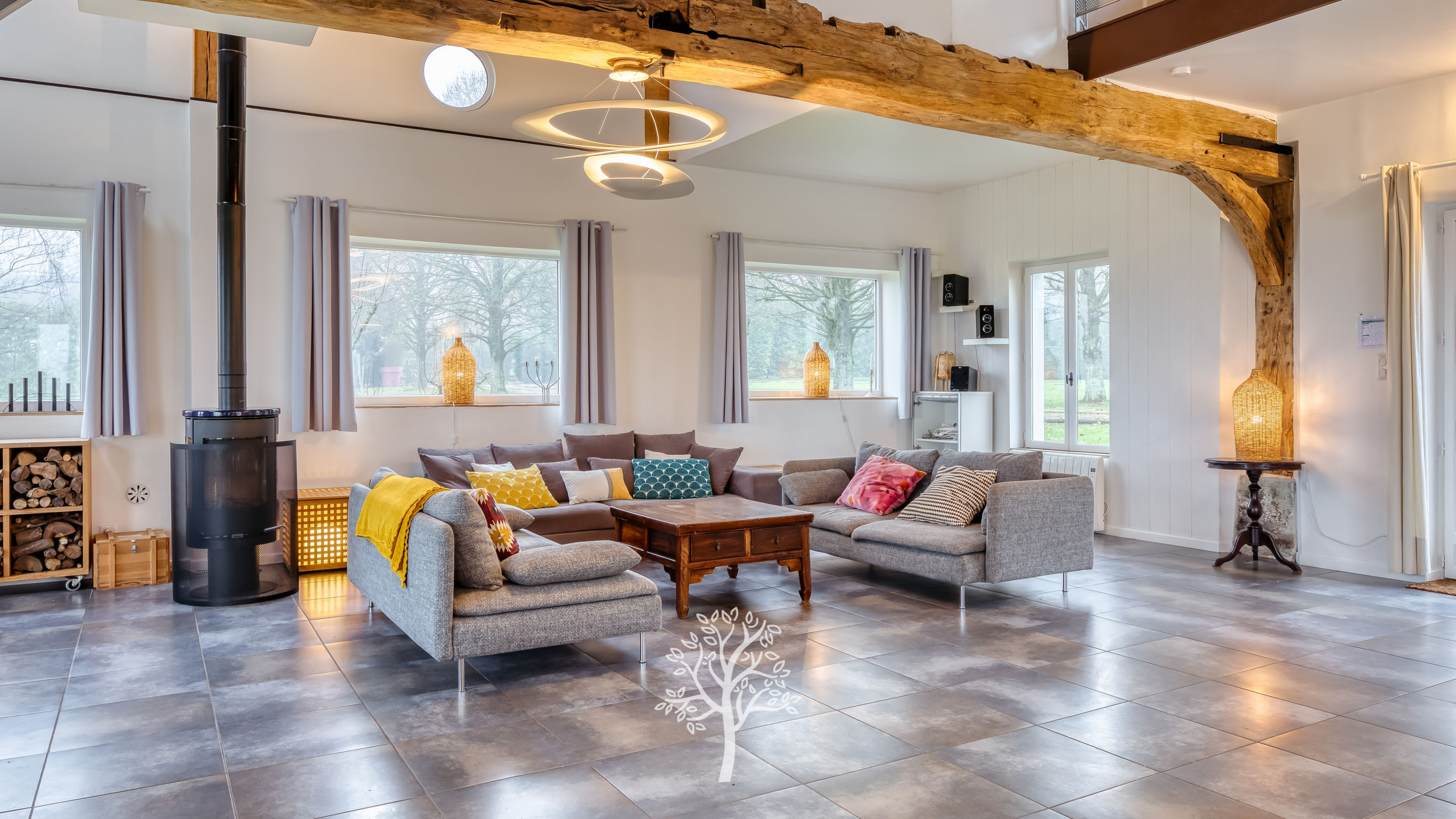 L’entrée ouvre sur un spectaculaire séjour de plus de 90 m², équipé d’un poêle à bois et largement éclairé par de grandes baies vitrées, dont plusieurs donnent accès à une belle terrasse de 30 m², idéale pour les beaux jours.