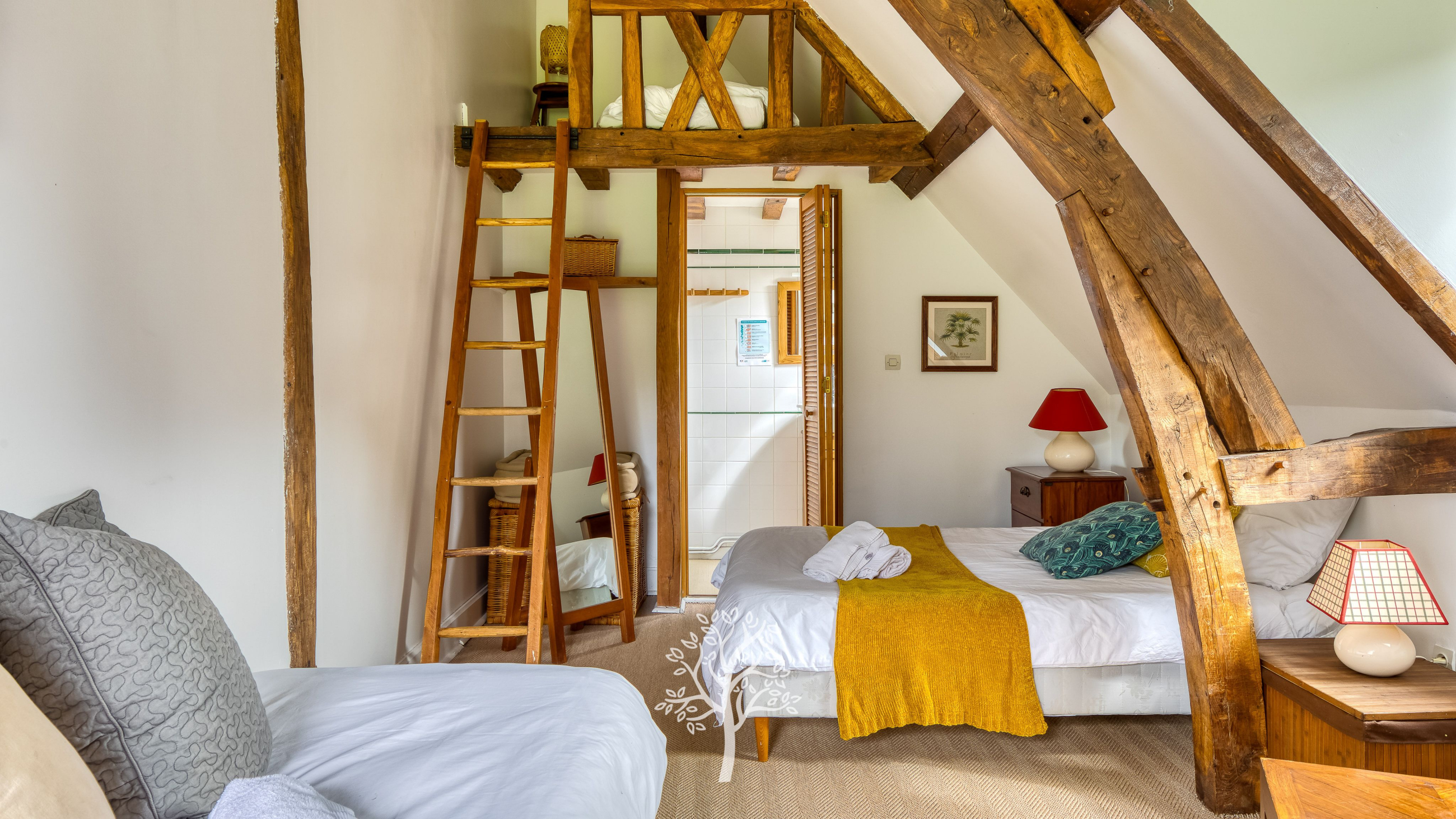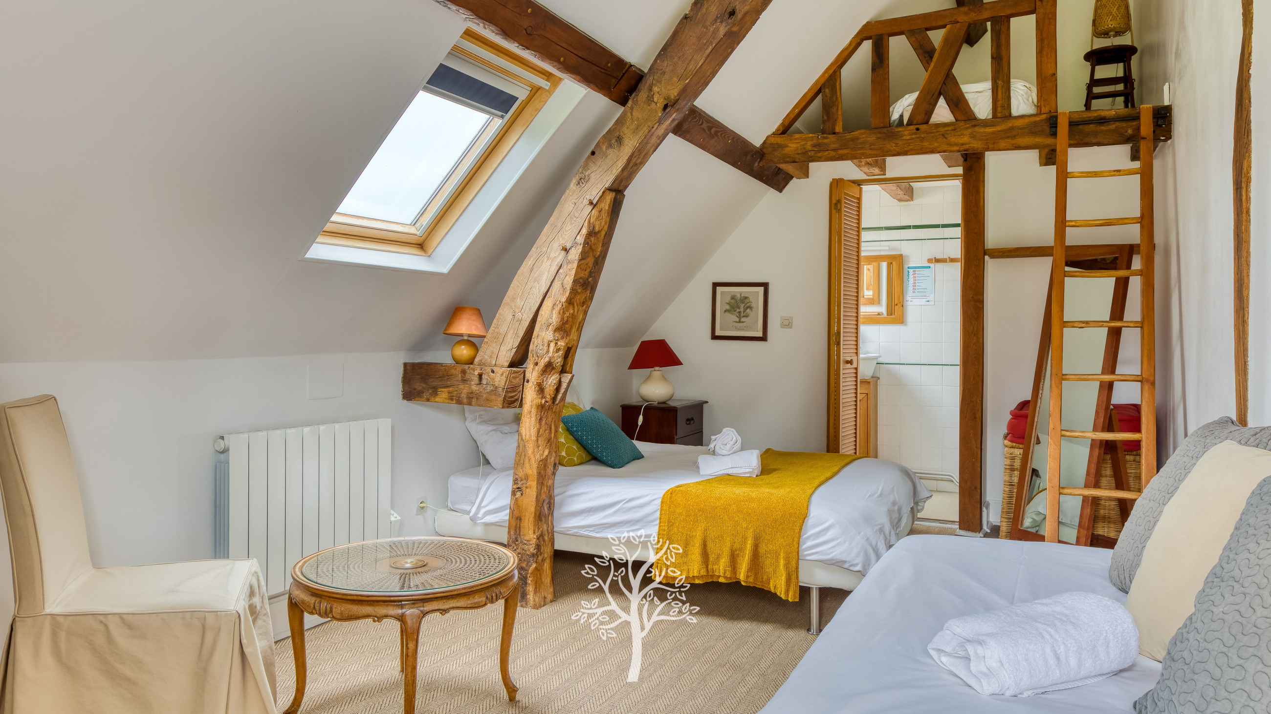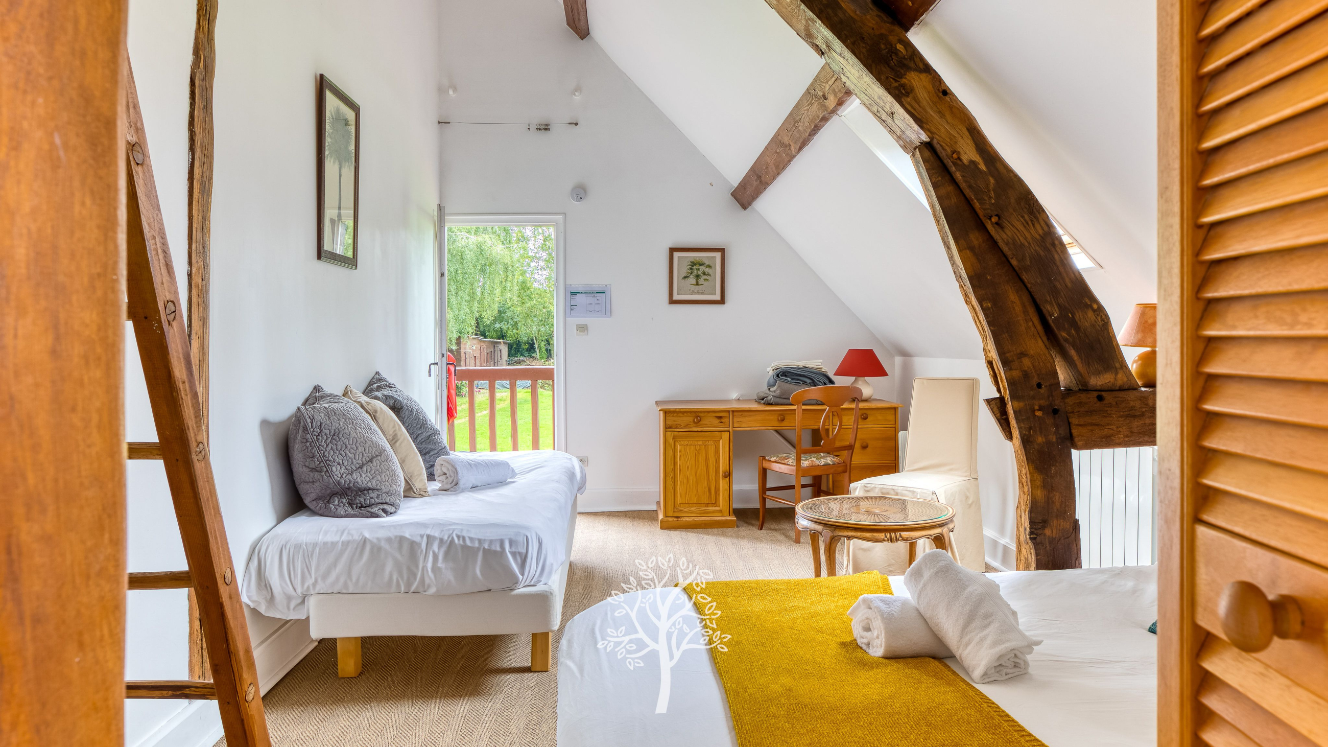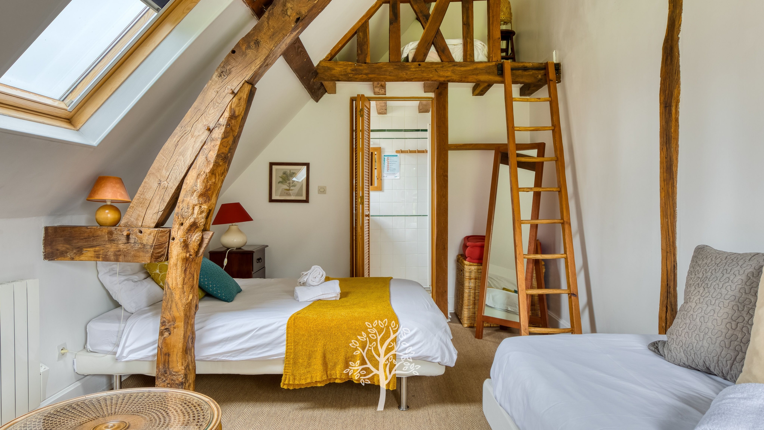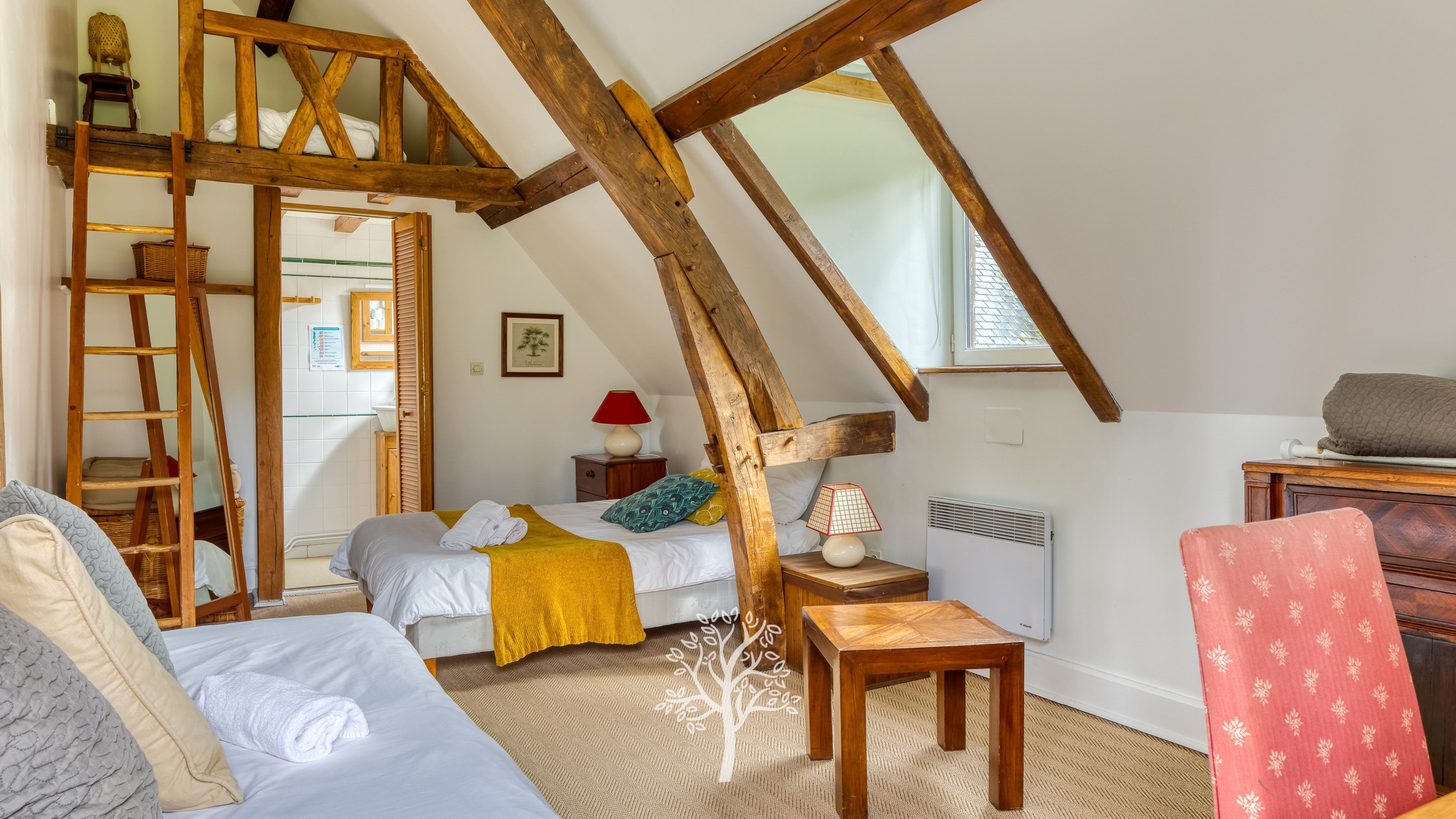 Deux chambres supplémentaires, chacune avec salle de douche et mezzanine privative, sont situées au-dessus du bureau et accessibles par un escalier extérieur, offrant une indépendance parfaite pour des hôtes ou une activité locative.