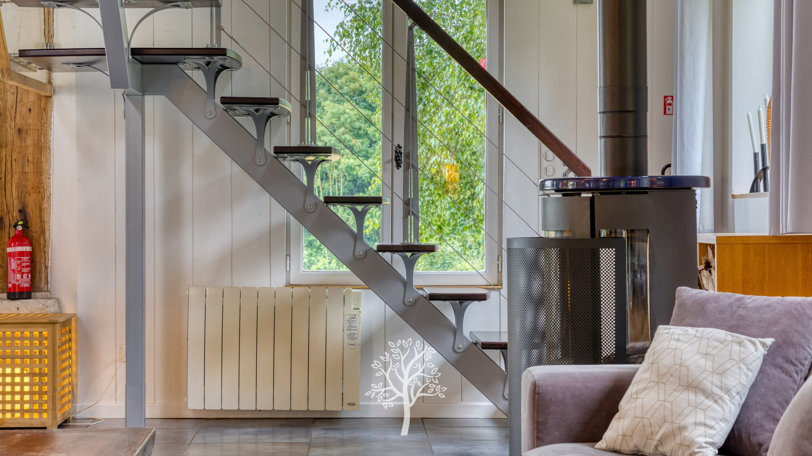 Depuis le séjour, un escalier mène à une mezzanine circulaire surplombant la pièce principale. Celle-ci dessert quatre chambres ainsi qu’une grande salle de bains avec WC.