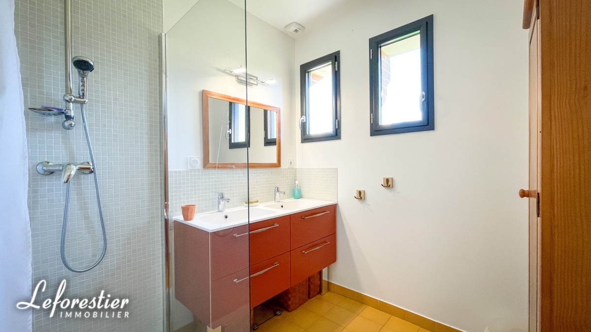Les deux chambres du rez-de-chaussée et les deux chambres de l’étage permet d’accueillir famille et amis. Avec une pièce d’eau à chaque étage la distribution est parfaite. Enfin le garage et la buanderie permettent de stocker la voiture, les vélos et est très utile pour les machines à laver et autres éléments techniques.