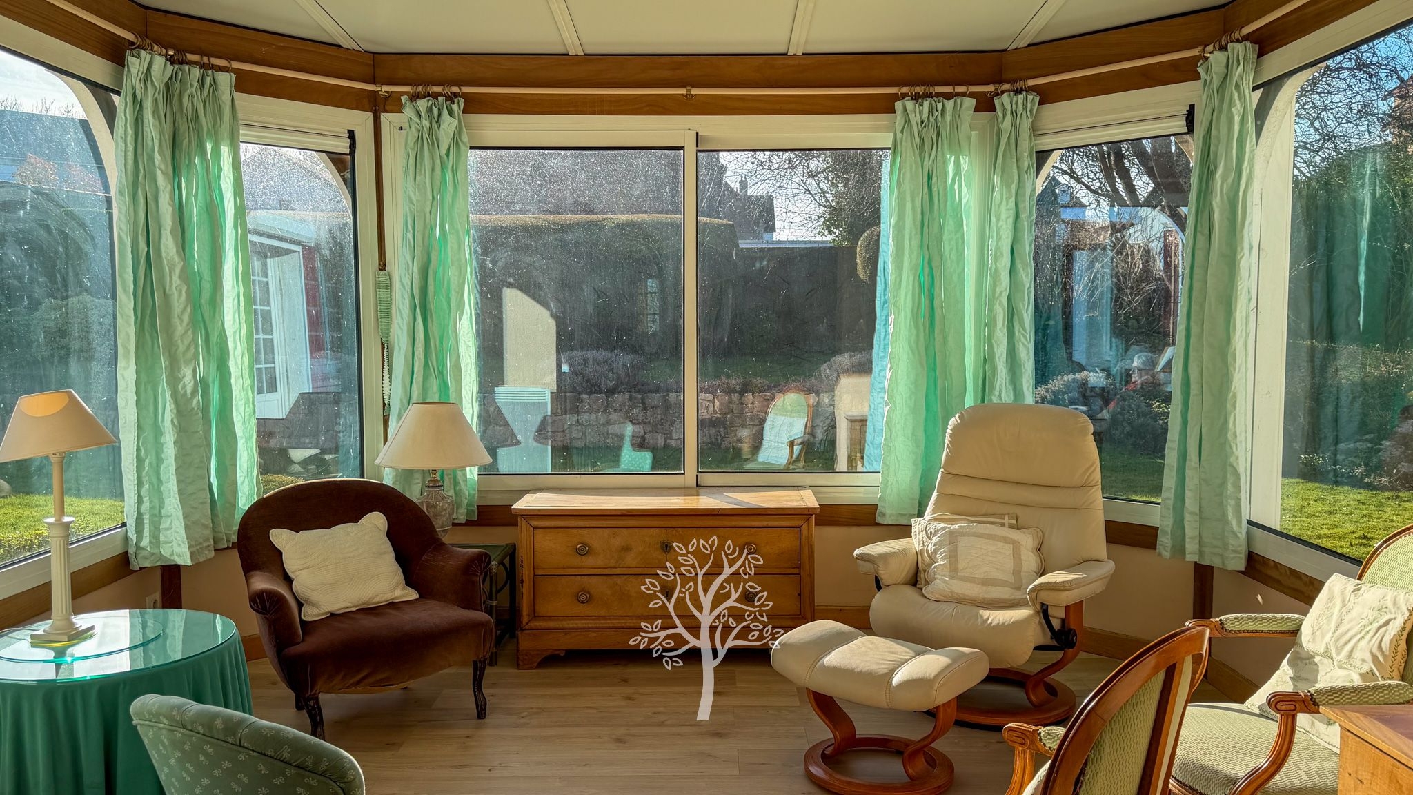 Le vaste salon, agrémenté d’une cheminée à foyer ouvert, crée une ambiance élégante et chaleureuse, particulièrement appréciable lors des soirées d’hiver. Tout au long de l’année, le bow-window devient un lieu privilégié pour partager des moments précieux en famille ou entre amis. Aux beaux jours, la terrasse s’impose naturellement, tandis que la véranda offre un refuge lumineux lors des journées plus fraîches.Le rez-de-chaussée se complète d’une salle à manger, d’un bureau parfaitement adapté au télétravail, ainsi que d’une cuisine sobre, fonctionnelle et conviviale.