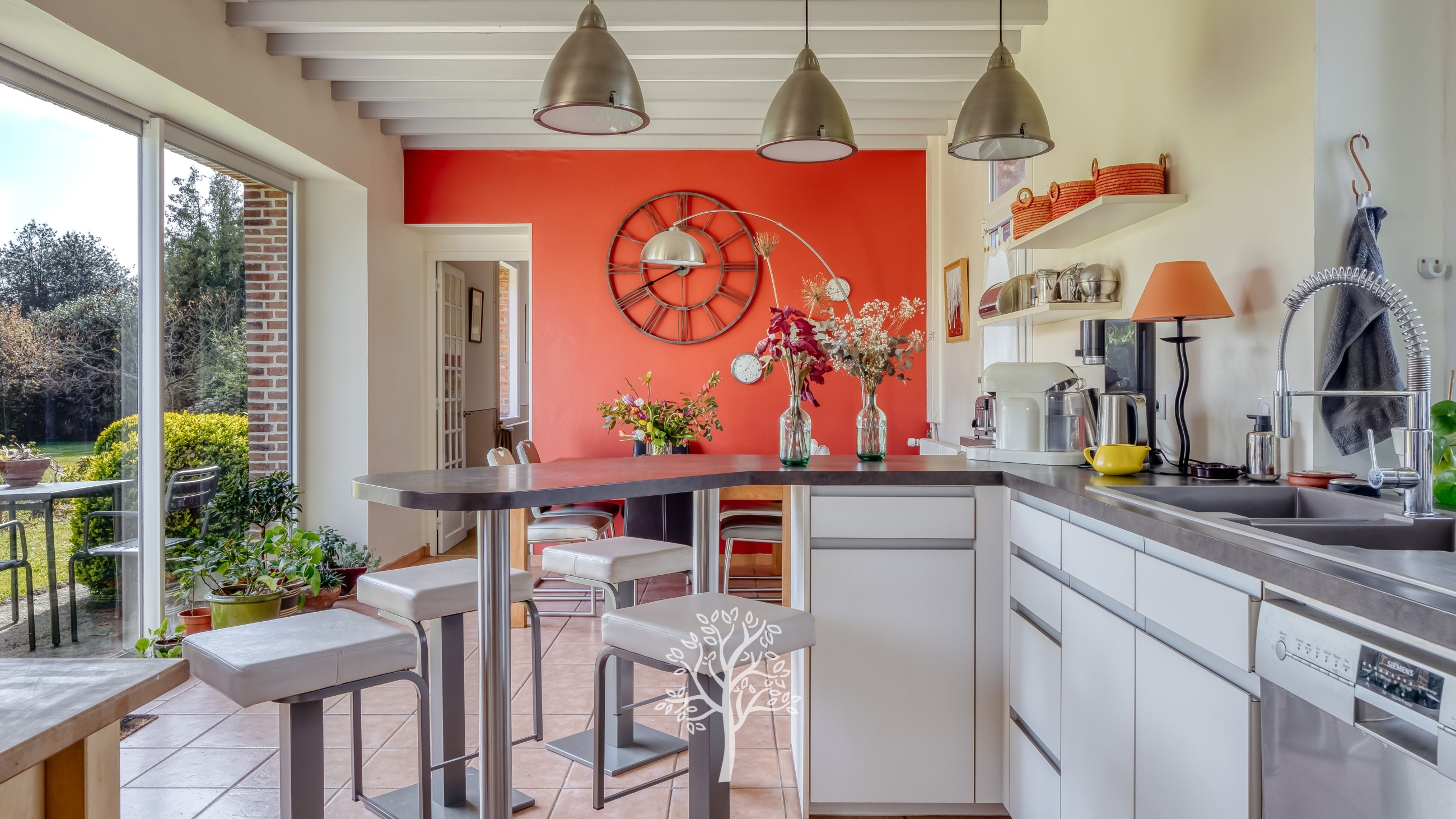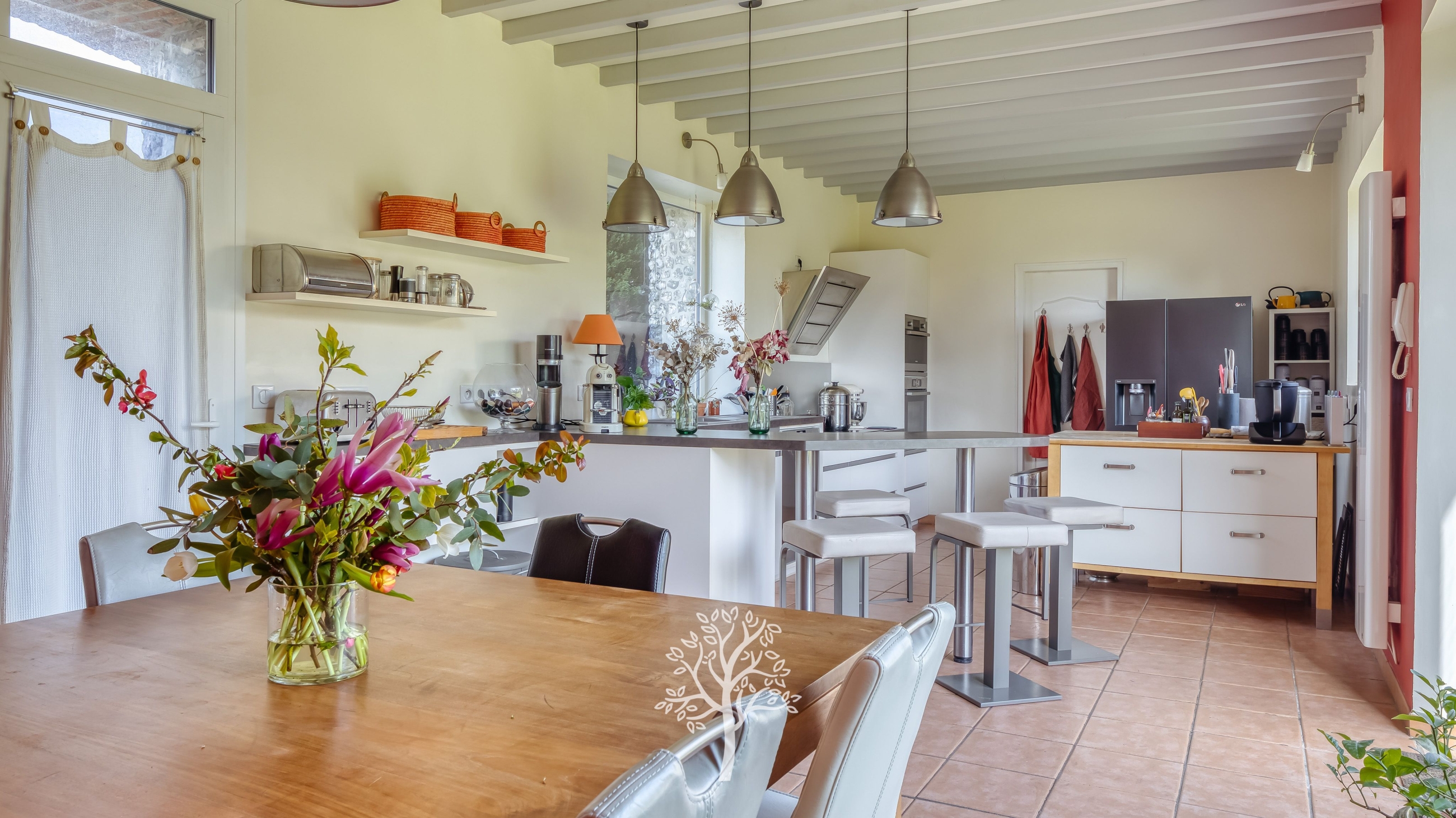 Entièrement rénovée avec soin, la demeure en briques et silex a su conserver toute son âme tout en intégrant des prestations de confort contemporain. La cuisine, pensée comme une véritable pièce de vie, s’ouvre généreusement sur le jardin grâce à de larges baies vitrées, offrant une belle luminosité et une continuité dedans-dehors très agréable.