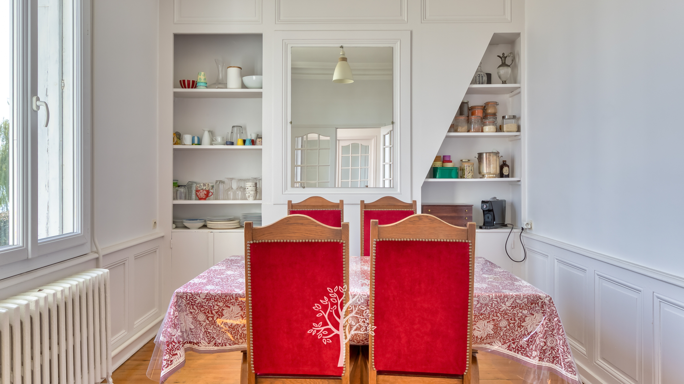 Dès l’entrée, le ton est donné : à droite, un salon baigné de lumière avec cheminée et parquet ancien, à gauche, une salle à manger chaleureuse ouvrant sur une cuisine, des toilettes invités, et l'accès à une cave aménagée.