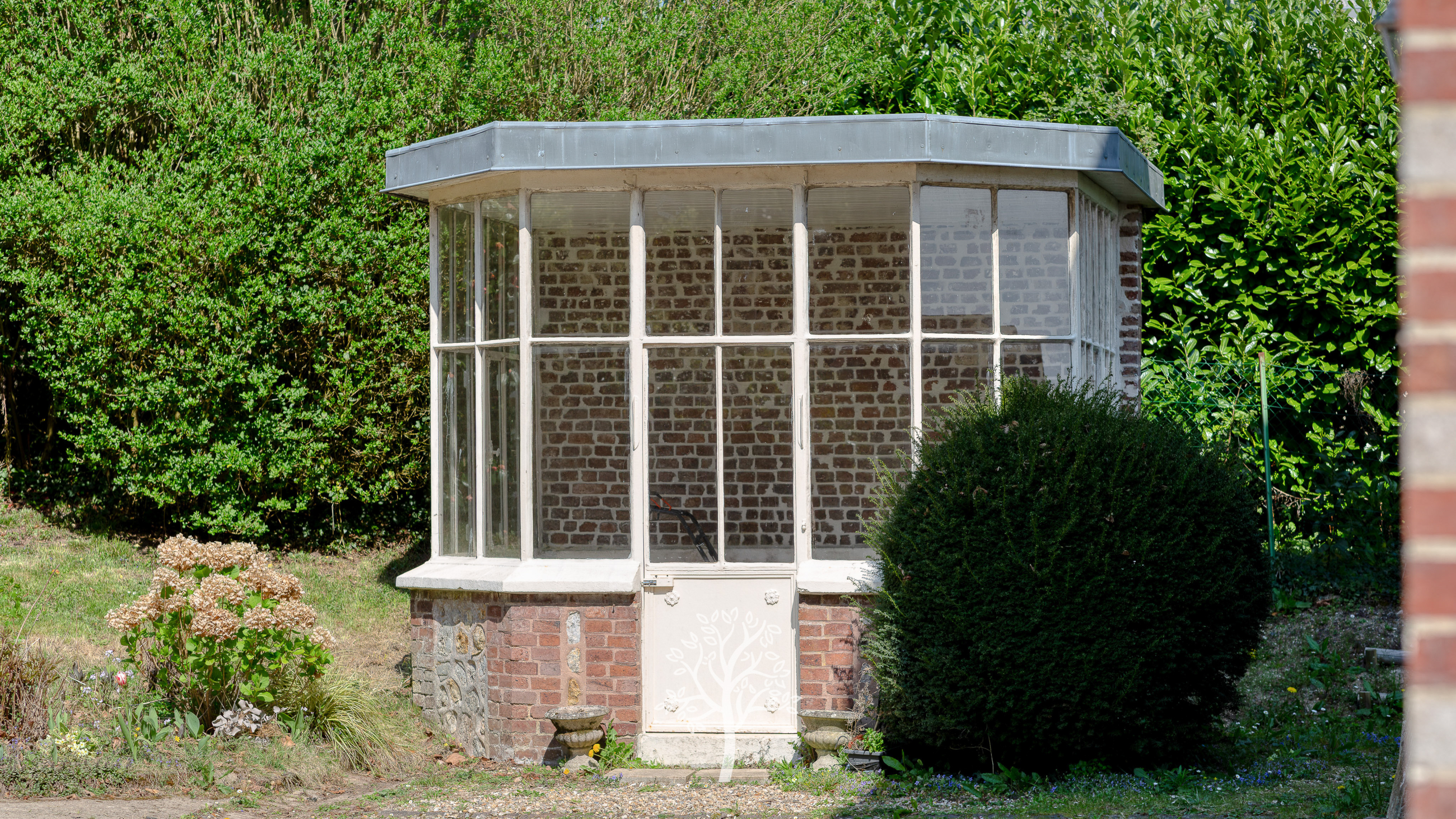 La propriété dispose également de plusieurs dépendances : une authentique serre ancienne, un bâtiment aménagé comprenant cuisine, salle d’eau, salle de réception et combles transformés en espace de vie, ainsi qu’un abri de jardin situé à l’entrée de la propriété.